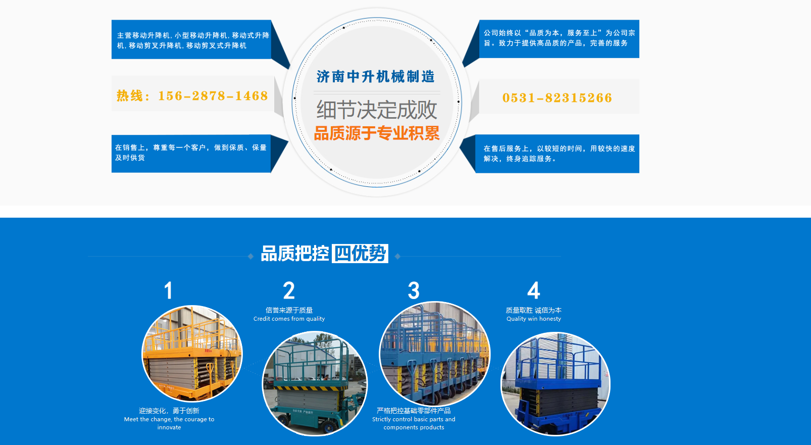 濟南中升機械制造有限公司主營移動升降機,小型移動升降機,移動式升降機,移動剪叉升降機,移動剪叉式升降機等產(chǎn)品,信譽良好,歡迎前來咨詢訂購! 在銷售上,尊重每一個客戶,做到保質(zhì)、保量及時供貨;在售后服務(wù)上,以較短的時間,用較快的速度解決,終身追蹤服務(wù)。 公司始終以“品質(zhì)為本,服務(wù)至上”為公司宗旨。致力于提供高品質(zhì)的產(chǎn)品,完善的服務(wù),快捷的供貨,無論您身處何方,都能感受到我們的優(yōu)良服務(wù)??蛻糁辽?,誠信為本?! g迎各界朋友來電,來函垂詢,選購!...